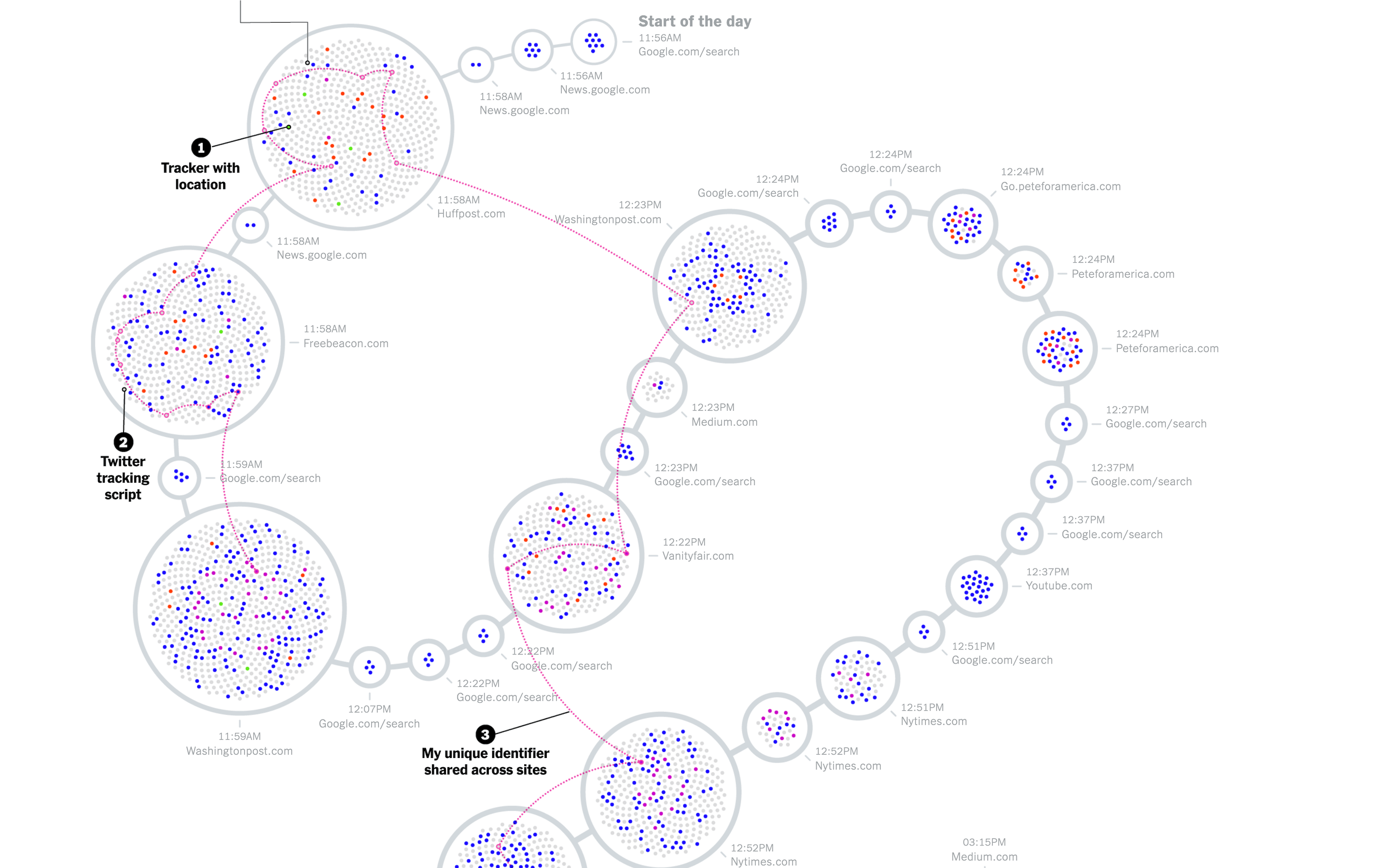 Note: The header image was created by Visual Cinnamon for The New York Times on an opinion piece on digital trackers. By now everyone is familiar and desensitized to cookie popups that bombard us on our first visit to almost every. These cookie consent alerts are there for a reason, they are required by new legislation such as GDPR and the California CPA. This legislation has been introduced to try to protect consumers from boundless data collection policies , which is a laudable goal. I’m not certain how much of a difference it’s made though as most users accept the terms as quickly as a EULA or a Windows Security Warning popup. Recently Senator Sherrod Brown has realized this and is trying to shift the burden of privacy from consumers onto the companies that hold the data. No longer will it be enough for a company to fall back on the “but you clicked on the Privacy Policy button” defense: